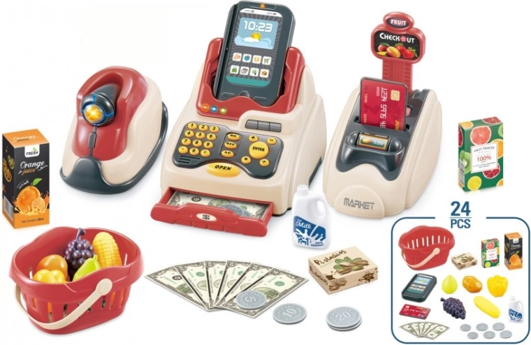 Il set comprende tutto ciò di cui un piccolo commerciante ha bisogno: cassa con tasti, lettore di carte, terminale di pagamento per i pagamenti senza contanti, cestino della spesa, soldi giocattolo e una ricca selezione di prodotti per il “carrello”. Ideale per il gioco di ruolo, lo sviluppo della comunicazione e della collaborazione con gli amici.