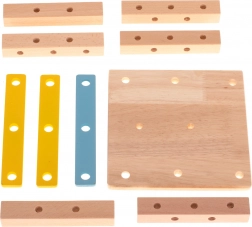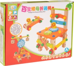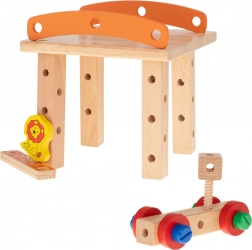 Questo set in legno di alta qualità consente ai bambini di assemblare uno sgabellino da officina e altri modelli originali. Grazie a viti, dadi e ingranaggi, i bambini esplorano i principi della meccanica semplice, allenano concentrazione e destrezza. Lo sgabellino è stabile e, grazie al sistema ben congegnato di fori e giunzioni, offre molte combinazioni.