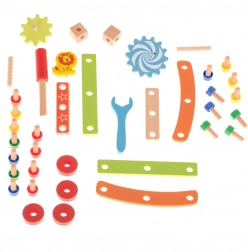 Inclusi cacciavite e chiave in legno, così i piccoli costruttori hanno tutto ciò di cui hanno bisogno. I pezzi colorati con motivi giocosi (ad es. leoncino e ingranaggi) incoraggiano il gioco creativo e insegnano a riconoscere i colori. Un’ottima idea come giocattolo educativo e regalo che intrattiene per ore.