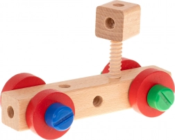 Inclusi cacciavite in legno, chiave, viti e dadi: i bambini imparano a collegare correttamente i pezzi e sviluppano la motricità fine.