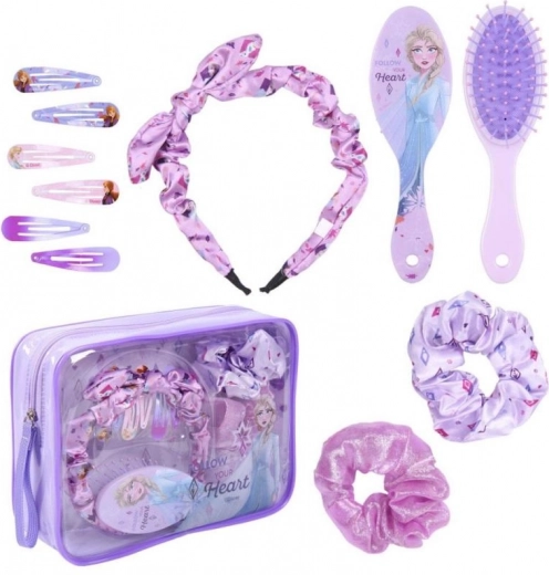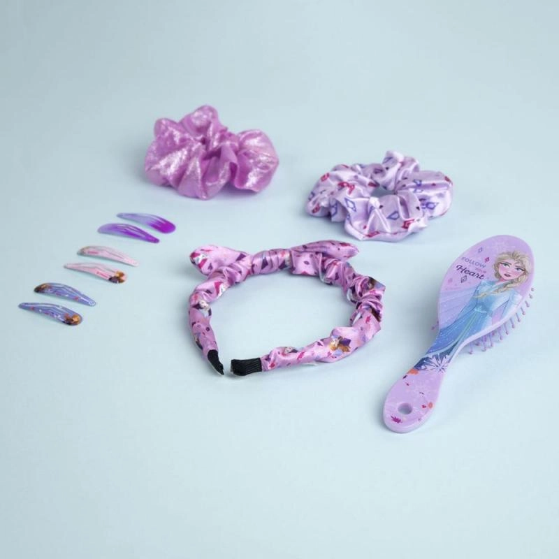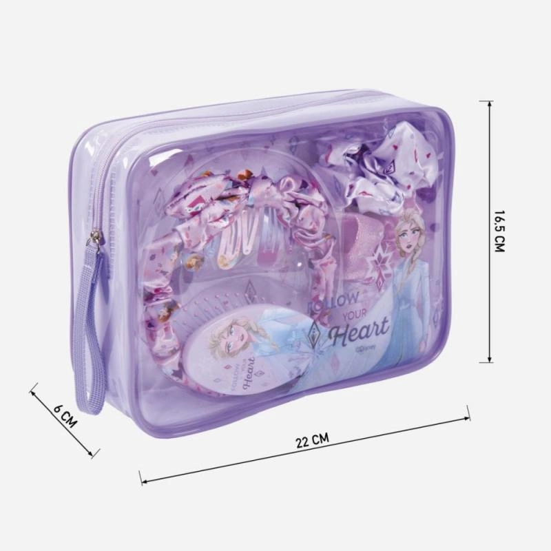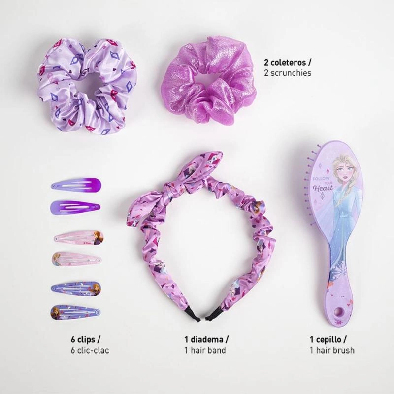 Un adorabile set regalo di accessori per capelli con tema FROZEN II farà felice ogni piccola amante dello stile. Contiene 10 pezzi pratici: 6 mollette in metallo con applicazione, una cerchietta con fiocco, una spazzola e 2 elastici in raso. Il tutto riposto in una comoda pochette con cerniera – ideale a casa e in viaggio. Adatto ai bambini da 6 anni.