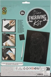 Nella confezione trovi tutto il necessario: immagine 25 × 20 cm, penna da grattare in plastica con punta metallica e cartoncino di prova per esercitarti con tratti e texture.