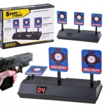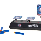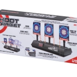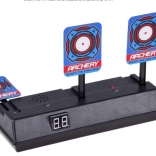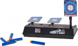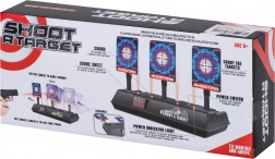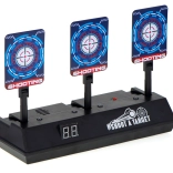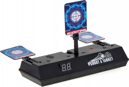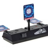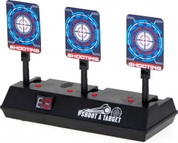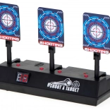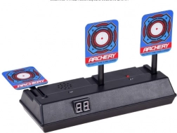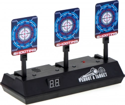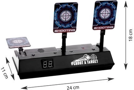 Il bersaglio può essere utilizzato con pistole a freccette di schiuma e offre vera esperienza grazie agli effetti sonori e luminosi. Dopo un colpo sentirai il suono di vetro frantumato o applausi. Il bersaglio è dotato di un contatore digitale che segna il punteggio. Si resetta automaticamente una volta colpiti tutti e tre i bersagli.