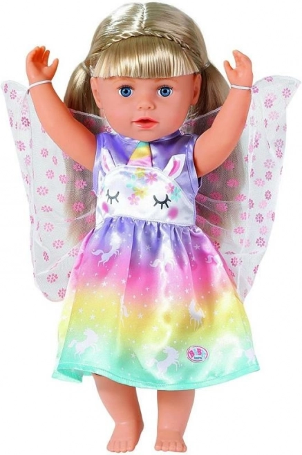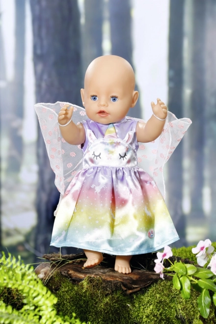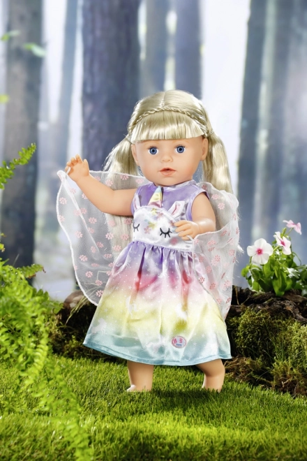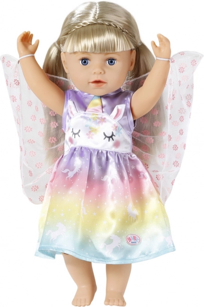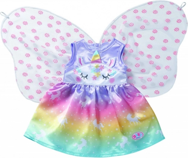 Le fate e gli unicorni stanno insieme come latte e biscotti. Il vestitino da fata per la bambola BABY born è realizzato in un meraviglioso tessuto arcobaleno. La gonnellina è stampata con magici unicorni che danzano nel cielo stellato. La parte superiore del vestitino è decorata sul davanti con il musetto di un unicorno, con orecchiette applicate e corno colorato. Una vera fata, naturalmente, deve avere anche le ali. Le ali trasparenti con fiorellini scintillanti sono cucite nella parte posteriore del vestitino e, non appena BABY born infila il braccio nella piccola asola nella parte superiore delle ali, queste si aprono. Abitino originale per bambole BABY born. Per un gioco fantasioso, vario e duraturo. BABY born Costume fiabesco Unicorno per bambole di 43 cm. Appendino incluso.