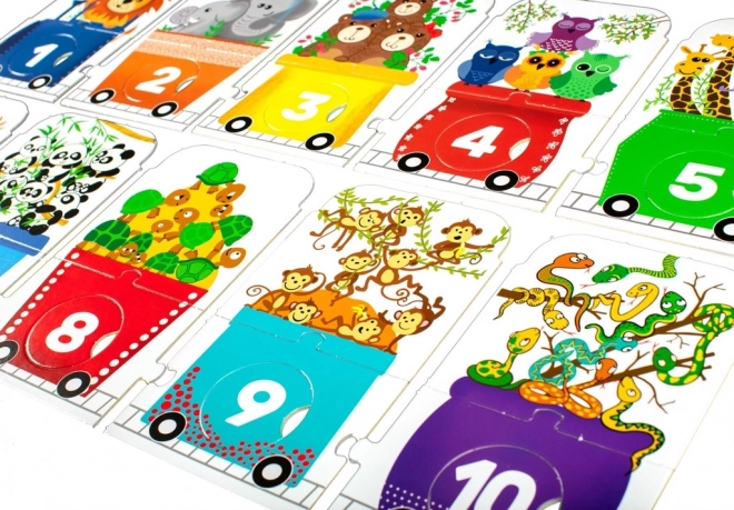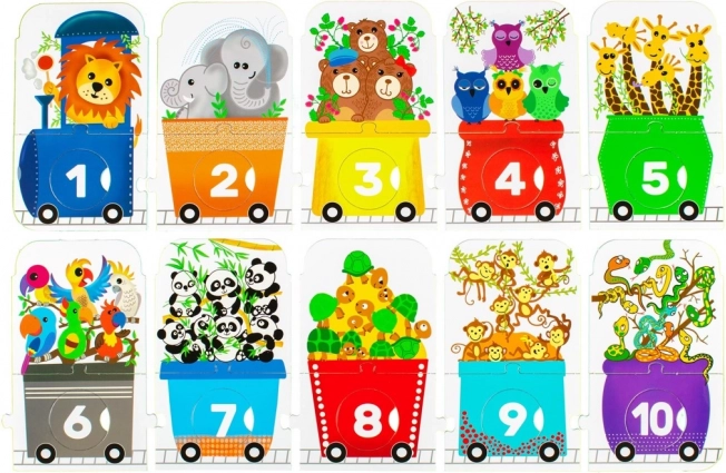 Il puzzle per bambini a forma di treno rappresenta una sfida divertente per i piccoli esploratori. È composto da una locomotiva e nove vagoni, ognuno con un numero diverso di animaletti: