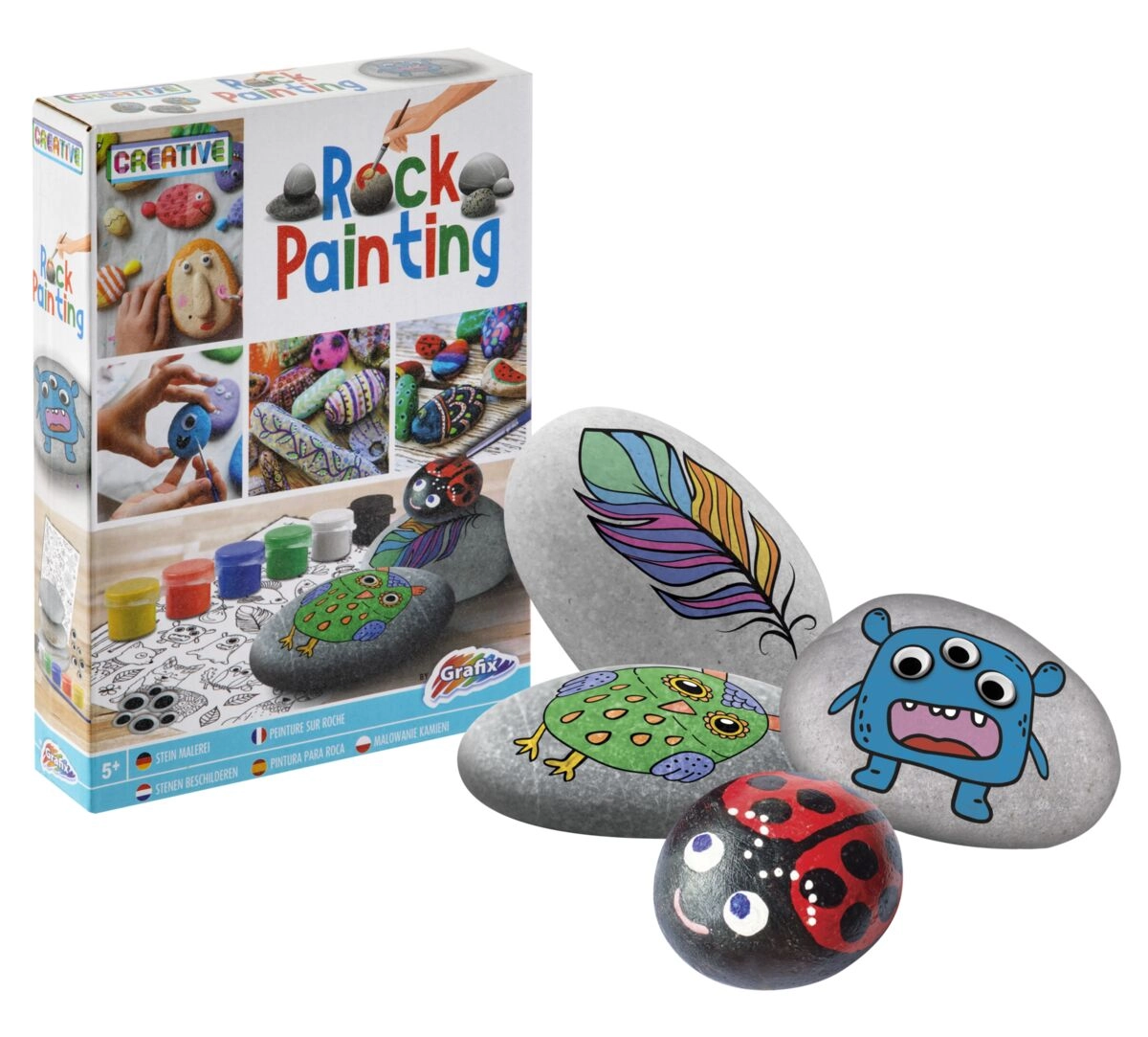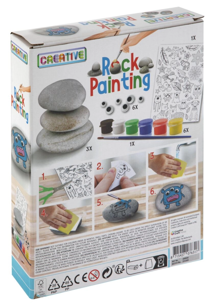 Il set include tutto ciò di cui i bambini hanno bisogno: ciottoli lisci, 6 colori, un pennello, adesivi e occhi mobili. Apri la scatola e inizia a creare senza ulteriori acquisti.