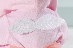 Lascia che la tua Baby Annabell viva momenti magici con questa vestaglia e pigiamino alla moda. La vestaglia è decorata con ali, che la rendono non solo un accessorio di moda ma anche confortevole per il gioco. Sotto la vestaglia la bambola indossa una tuta corta con la stampa di una pecora che si gode una doccia arcobaleno. Per tenere i piedini della bambola al calduccio, il set include anche calzini rosa con immagini di ali.