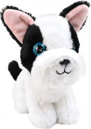 Il cagnolino di peluche con pelo bianco e nero e grandi occhioni è piacevole al tatto e ideale per coccole e gioco.