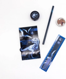 Elegante set scolastico a tema Jurassic World offre tutto il necessario per scrivere e prendere appunti: matita, gomma sagomata, scatolina per temperamatite, righello e blocco note sagomato.
