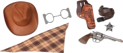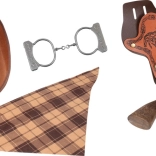 Con questo set ottieni tutto ciò di cui hai bisogno per un'esperienza da cowboy perfetta: cappello, fondina per revolver, foulard, manette, stella da sceriffo ed elegante revolver argentato.