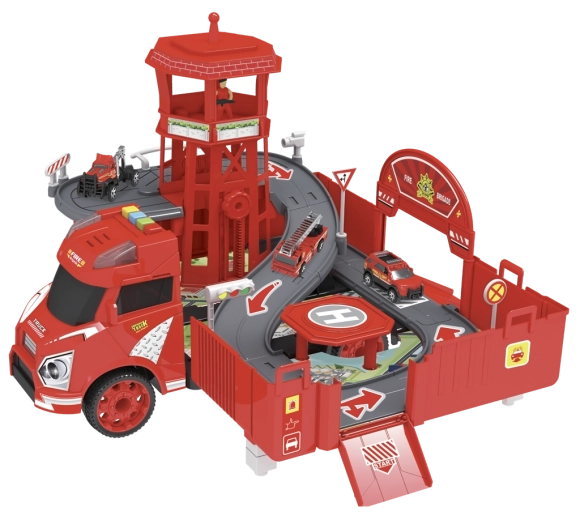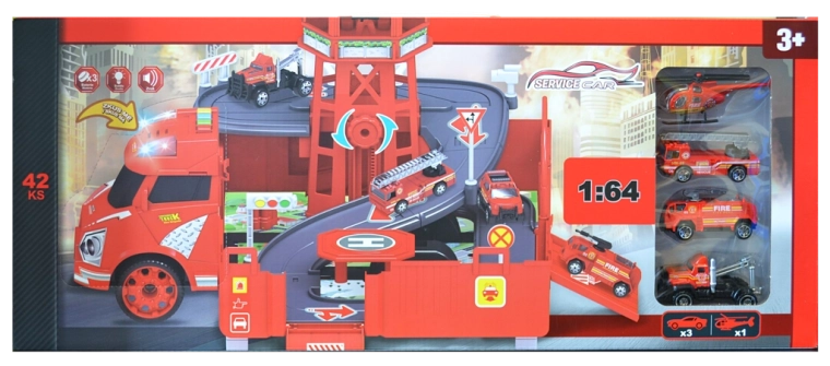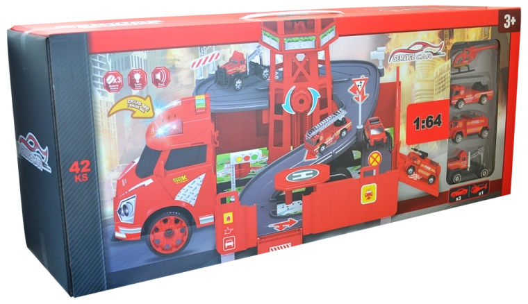 Stazione dei vigili del fuoco con garage con accessori (set). Dimensioni del garage aperto: 46,5 × 49 × 29 cm. Pulsanti per effetti sonori e luminosi, ruote libere, funzione “PROVAMI”. Attivazione della funzione PROVAMI: rimuovere la linguetta dal vano batterie, situato sulla cabina del veicolo, e provare le funzioni premendo i pulsanti posti sul tetto della cabina. Contenuto del set: autopompa/garage 2 in 1 (trasformazione da veicolo a garage e viceversa), modellini in metallo in scala 1:64 (6 pezzi) e elicottero.