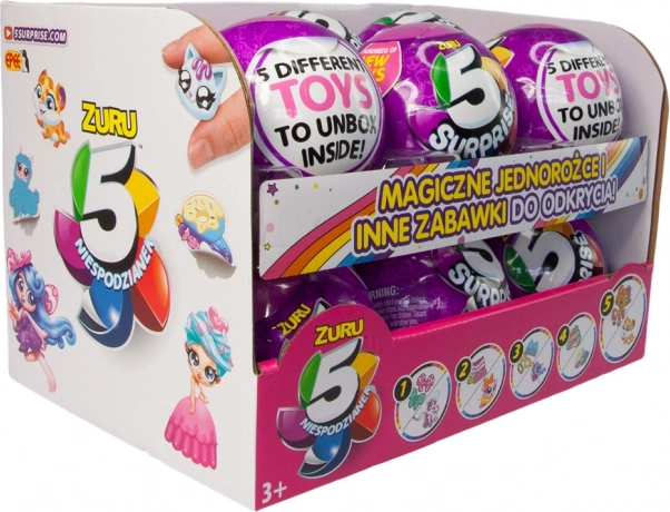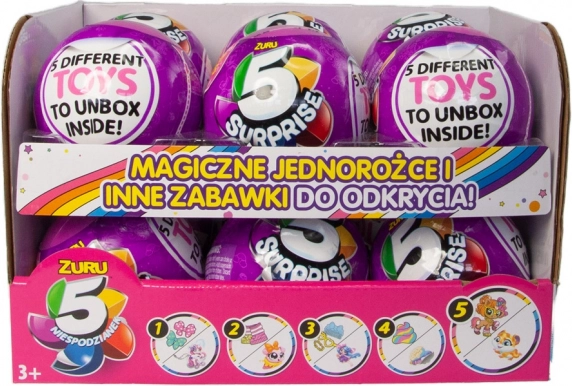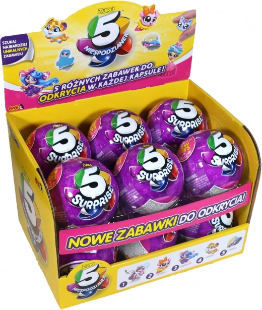 Immergiti nel mondo misterioso di 5 Surprise Serie 2. Queste sfere sono la scelta ideale per i bambini che amano le sorprese e scoprire nuovi giocattoli. Ogni sfera contiene cinque sezioni separate che puoi aprire facilmente per trovare veri e propri tesori, dalle figure agli accessori. Il giocattolo è confezionato in una pellicola opaca, aumentando la suspense e la curiosità durante l'apertura.