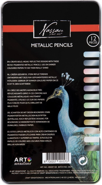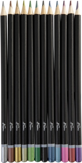 Il set di pastelli metallici Nassau offre colori brillanti e luminosi che donano alle tue illustrazioni un riflesso unico. Rendono al meglio su carte scure, dove il loro effetto si manifesta appieno. Grazie al diametro ergonomico della matita e alla solida struttura in legno, si impugnano comodamente e resistono all’uso frequente.