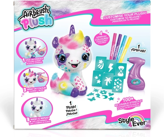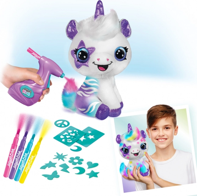 - Unicorno di peluche, aerografo, 3 ricariche di colore, 120 stencil adesivi, guanti protettivi in plastica, istruzioni