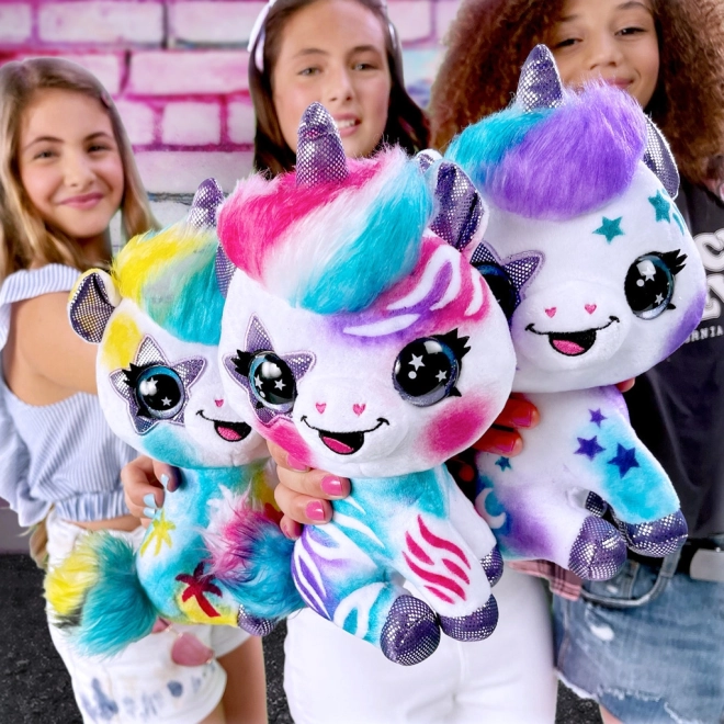 Facile spruzzatura dei colori sull’unicorno di peluche con stencil o a mano libera. Perfetto per principianti e piccoli artisti.