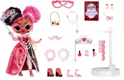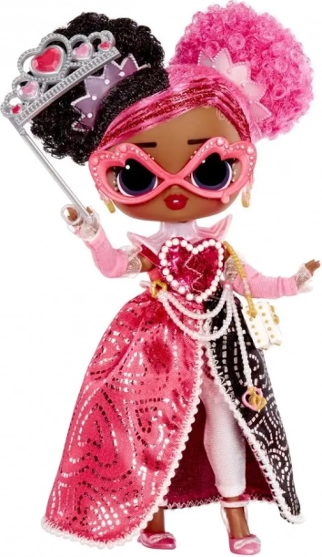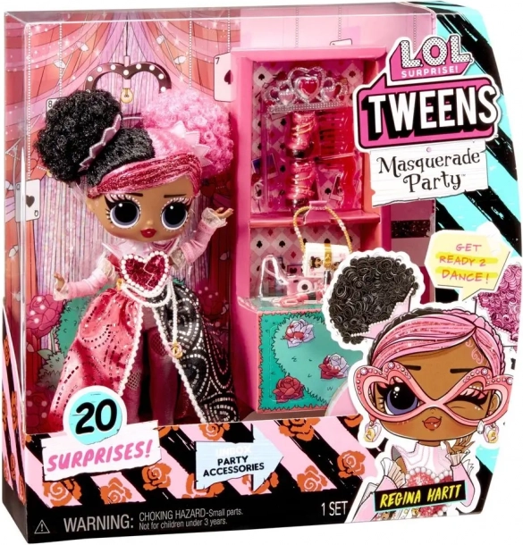 La bambola L.O.L. Surprise Tweens Regina Hartt sfoggia uno stile audace rosa e nero con perle, cuoricini e dettagli scintillanti. È pronta a brillare al ballo in maschera e conquisterà tutte le amanti degli accessori moda, travestimenti e styling.