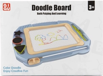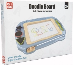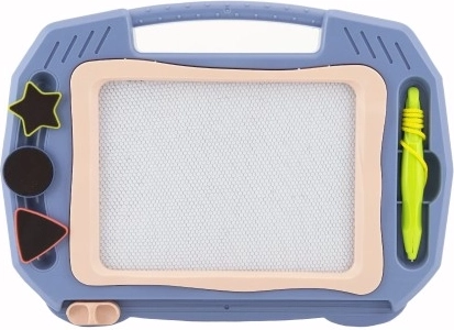 Scoprite un modo divertente per stimolare la creatività dei bambini: lavagna magnetica da disegno di colore blu con penna con cordino e tre timbrini magnetici (cerchio, stellina, triangolo). Con un solo movimento del cursore cancellate facilmente l’immagine e potete ricominciare a creare all’infinito.