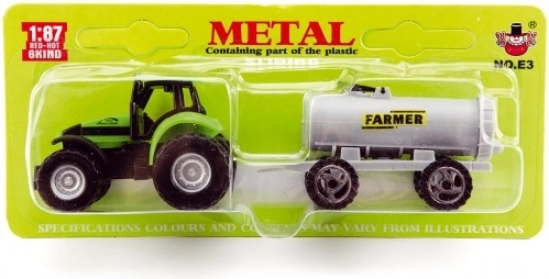 Modello di trattore con grandi ruote nere e un serbatoio grigio, etichettato come 'FARMER'.