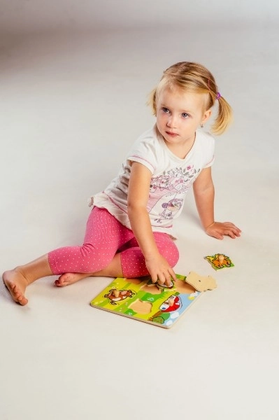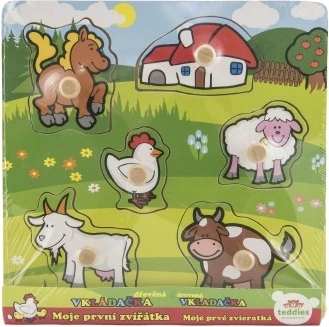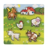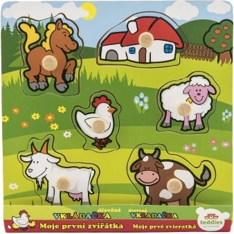 Il puzzle aiuta i bambini a conoscere vari animali domestici, come il cavallo, la capra, la pecora, la gallina e la mucca. Ognuno di essi ha una forma e un colore unici.