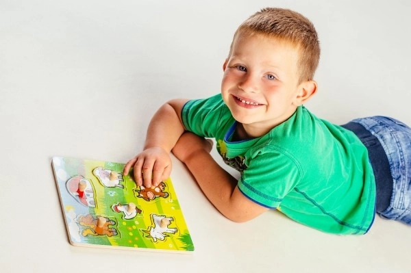 Ogni pezzo del puzzle è dotato di un piccolo manico di legno, grazie al quale i bambini possono facilmente esercitarsi a prendere e posizionare i pezzi nel posto giusto.