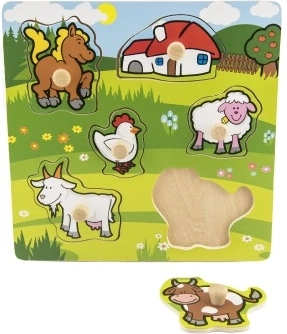 Questo puzzle include in totale 5 animali colorati, tra cui un cavallino, una capra, una pecorella, una gallina e una mucca, che sono facilmente afferrabili grazie alle piccole maniglie di legno. Ogni pezzo ha il suo posto sulla base di legno, il che aiuta anche i bambini a imparare il corretto posizionamento di ogni pezzo.