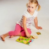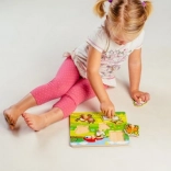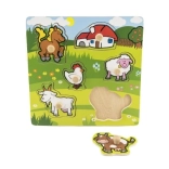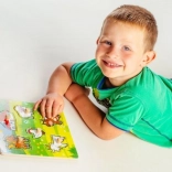 Puzzle in legno Fattoria è un giocattolo ideale per i piccoli, che sviluppa la motricità fine e la conoscenza degli animali tramite pezzi colorati con maniglie.