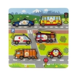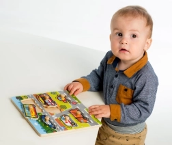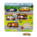 Ognuna delle sei figure da inserire rappresenta un diverso mezzo di trasporto, come un'auto della polizia, un autobus, un'ambulanza, un camion dei pompieri, un camion della spazzatura e un'auto privata. L'incastro è facilitato da una base in legno e dalle maniglie che permettono alle piccole mani di maneggiare facilmente i pezzi.