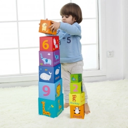 Questi blocchi colorati contengono numeri, animali e parole inglesi, aiutando così nell'apprendimento e nello sviluppo delle capacità cognitive.