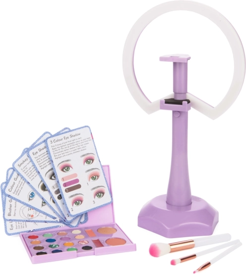 - 3 pennelli, palette di ombretti, rossetti, fard, luce LED, carte con istruzioni
