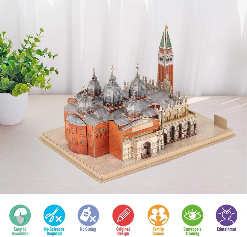 Scopri il fascino di Venezia con il dettagliato kit della Piazza San Marco. Il puzzle 3D CUBICFUN della collezione National Geographic è realizzato in speciale schiuma multistrato rivestita con carta stampata laminata, che garantisce colori vividi e lunga durata. I pezzi sono pretagliati: basta staccarli e assemblarli seguendo le istruzioni.