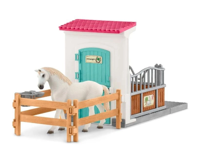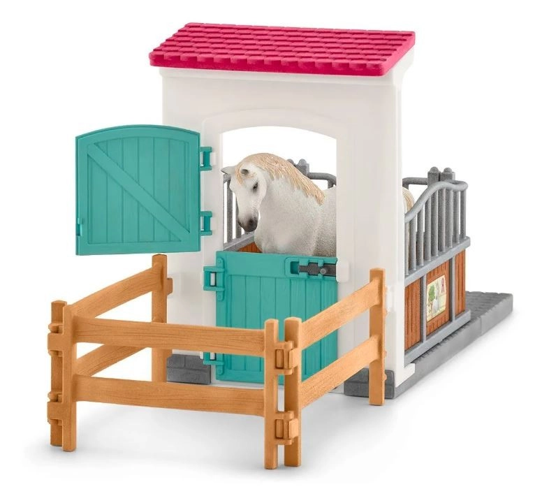 Questo recinto per cavalli della collezione Schleich Horse Club è ideale per tutti i piccoli amanti dei cavalli. Fornisce ai cavalli un rifugio piacevole con mangiatoia e abbeveratoio, per potersi riposare bene.