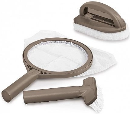 Il set include una spazzola curva per la cura delle pareti laterali interne, una rete per le impurità e una spugna detergente per eliminare lo sporco.