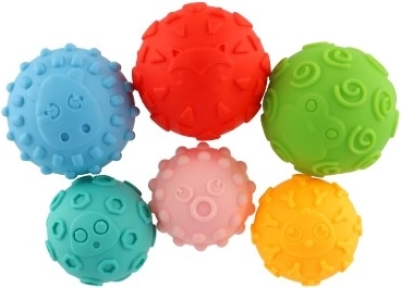 Ogni pallina fischia quando viene premuta, motivando i bambini al gioco, rafforzando la presa e sviluppando la percezione uditiva.