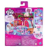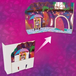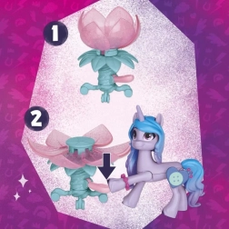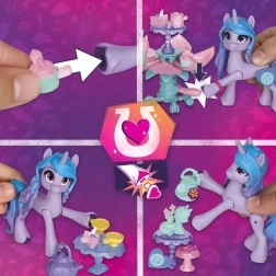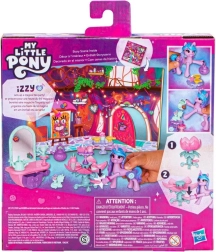 Il set include uno sfondo decorativo di camera da letto in cartoncino, un tavolo pieghevole con attivazione Hoof to Heart e numerosi accessori che Izzy può davvero “tenere con lo zoccolo”. Premendo lo zoccolo sul pedale, il fiore si trasforma in un tavolo aperto: perfetto per il tè delle cinque. Gli adesivi permettono di decorare la scena e gli accessori.