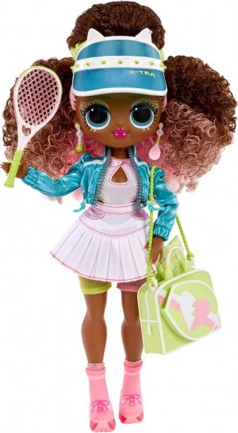 Bambola vestita in un colorato outfit da tennis con berretto, racchetta e borsa sportiva che unisce perfettamente moda e gioco.