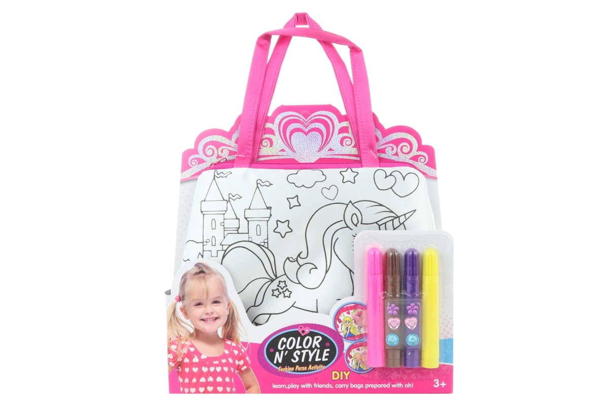 - Contenuto della confezione: borsetta, 4 pennarelli per tessuti, strass decorativi