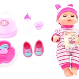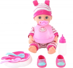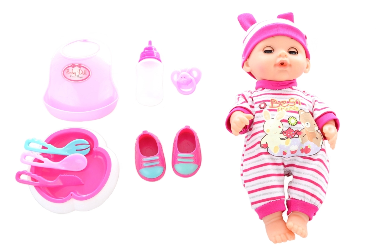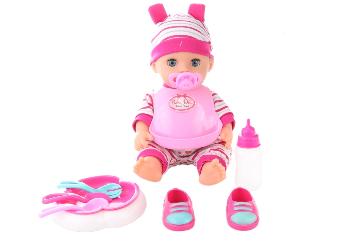 Il set include scarpette, bavaglino in plastica, biberon, piattino, posate e altri accessori per un gioco di fantasia variegato.
