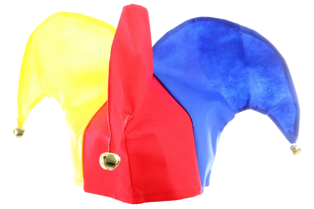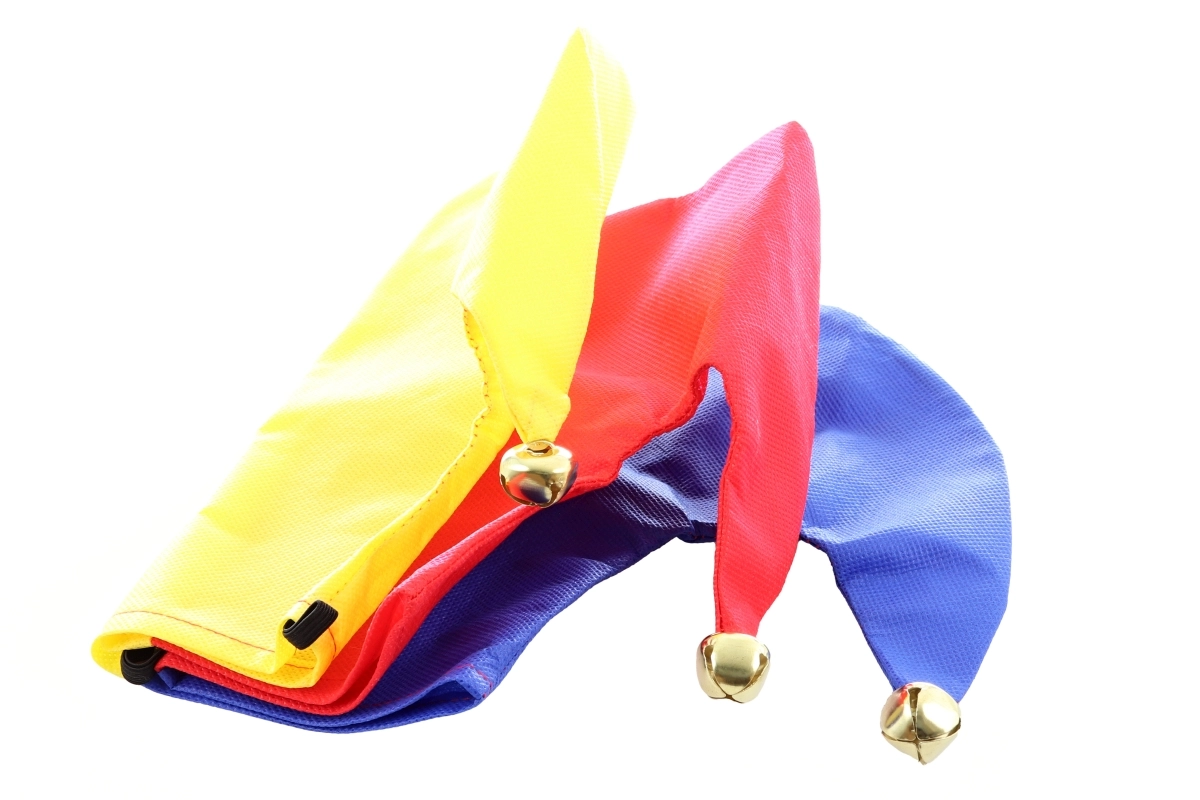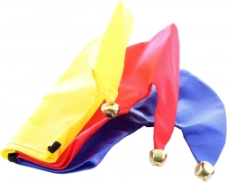 Cappello da clown colorato in giallo, rosso e blu con campanellini metallici per un effetto giocoso ad ogni movimento.