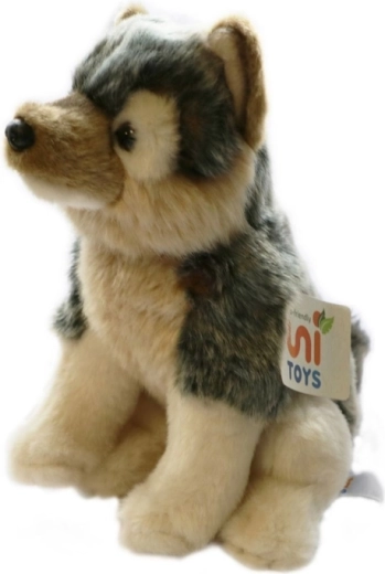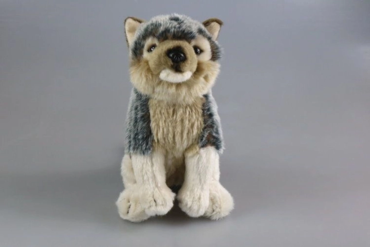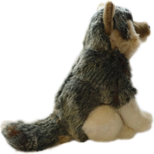 Lupo di peluche seduto di dimensioni circa 20 x 24 x 11 cm (senza coda). Lunghezza della coda circa 9 cm. Età 0+