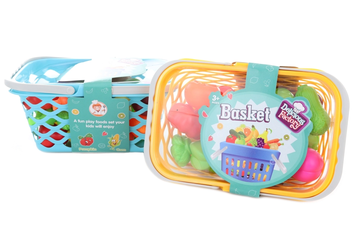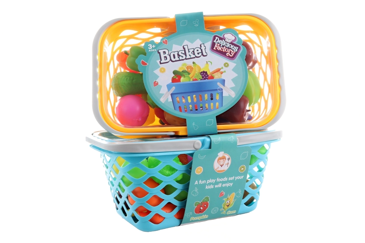 Questo colorato set di frutta e verdura di plastica nel cestino farà felice ogni piccolo amante della cucina e della spesa. Il cestino con griglia di aerazione e coperchio funge da pratico contenitore e borsa da trasporto, così i bambini possono portare il loro kit in qualsiasi gioco.
