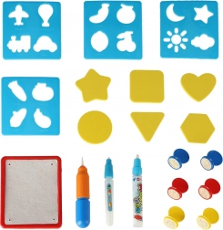 La confezione include timbri, stencil, pennarelli ad acqua e un pennello. I bambini imparano forme, colori e migliorano la motricità fine.
