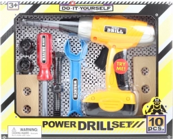 Divertente e sicuro set di attrezzi per bambini con realistico trapano senza batterie, che ruota e ronza quando si preme il pulsante. Inclusi anche cacciavite, chiave, listelli di legno e viti per montaggi creativi. Ideale per bambini dai 3 anni.