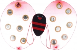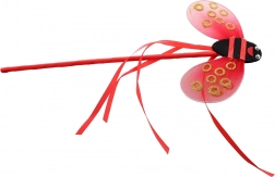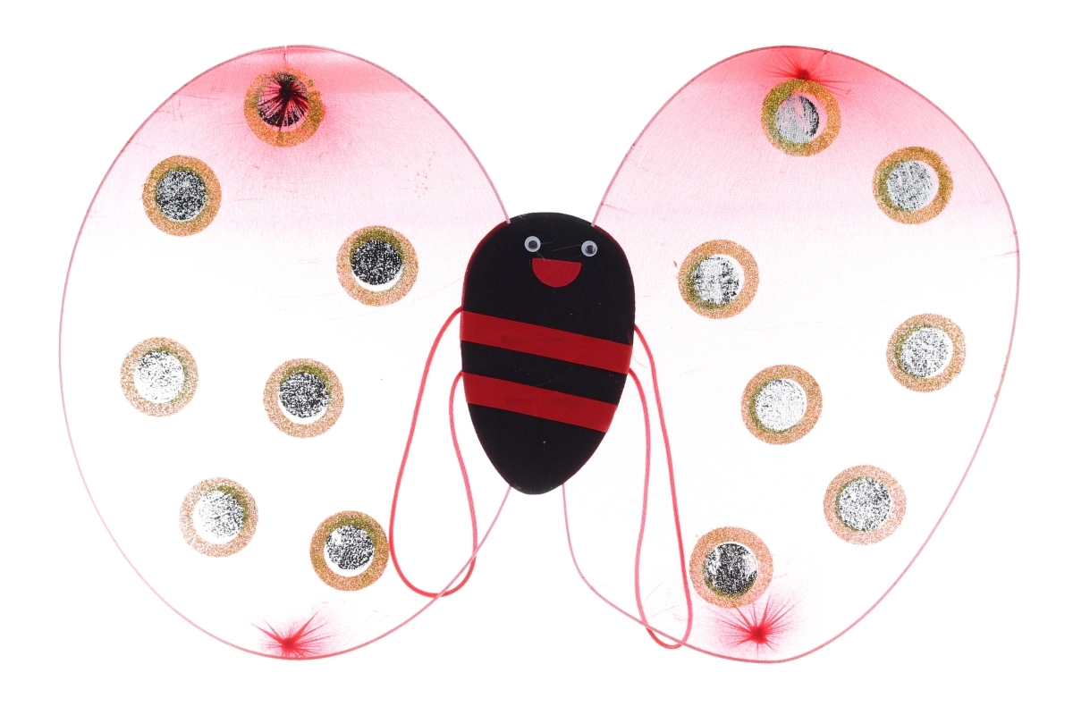 Il set comprende ali traslucide rosa-rosse con pois scintillanti, gonna elastica a righe rosso-nere, cerchietto con antenne flessibili e bacchetta abbinata con nastri. La misura del set è pensata per bambini dai 3 anni; dimensioni della confezione ca. 49 × 57 cm.