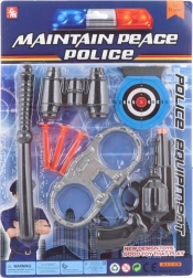 Pistola con ventose, 3 dardi con ventosa, binocolo, manganello, bersaglio, manette