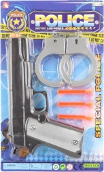 Il set della polizia contiene una pistola, manette e 3 proiettili con ventosa. Dimensioni della confezione circa 31,5 x 19 x 3 cm. Età 3+.