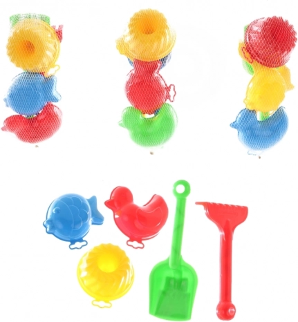Divertente set da sabbia per piccoli costruttori, include paletta, rastrellino e tre formine. Leggero, facile da trasportare e confezionato in una rete – ideale per il parco giochi e il mare.
