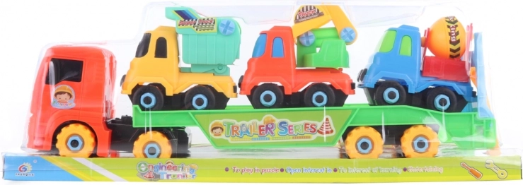 Camion avvitabile con tre veicoli da cantiere. Plastica resistente, sviluppa motricità e creatività. Dimensioni camion 39×9×7 cm. Ideale per bambini dai 3 anni.