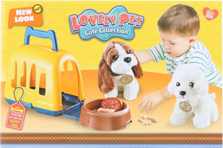 La confezione include un cagnolino di peluche di circa 18 × 12 cm, un trasportino in plastica (20 × 21 × 13 cm), una ciotola e il cibo. Tutto è adatto alle piccole mani dei bambini e si trasporta facilmente.