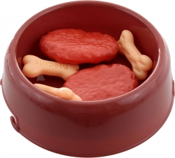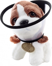 Cane di peluche, cuccia, collare elisabettiano, ciotola, stetoscopio, siringa e altri accessori