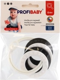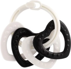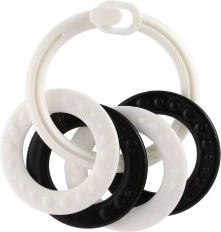 Questo set di anelli in versione bianco e nero è progettato per i più piccoli. I colori a contrasto attirano l’attenzione, aiutano ad allenare la concentrazione e supportano un sano sviluppo della vista. Grazie alle diverse forme e superfici, il bambino allena la motricità fine e la coordinazione mano–occhio.